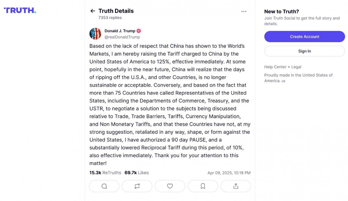 «75-тен астам ел келіссөз жүргізу үшін хабарласты... және менің ұсынысым бойынша олар АҚШ-қа қарсы жауап шараларын қолданған жоқ. Сондықтан мен 90 КҮНДІК ҮЗІЛІС пен осы кезеңде 10% деңгейінде төмендетілген өзара тарифтер енгізуге рұқсат бердім. Олар бірден күшіне енеді».