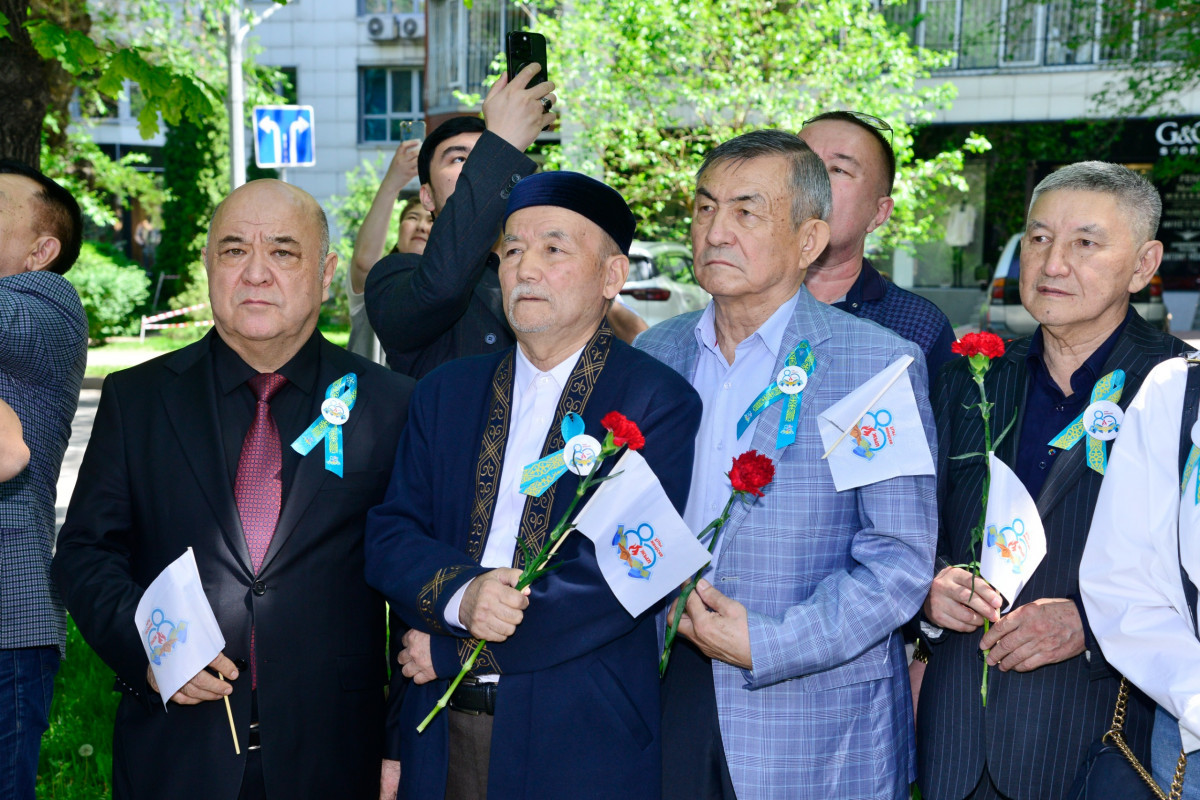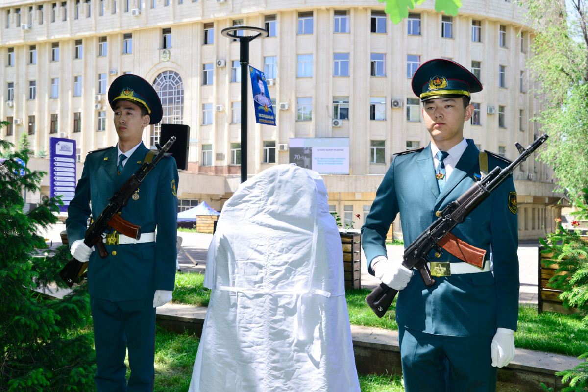 Абай университетінің Басқарма төрағасы-ректор Болат Тілеп құттықтау сөзінде: «Осы күнге дейін университетімізден майданға аттанып, Кеңес Одағы батыры жоғары дәрежесіне ие болған 8 тұлға белгілі болған болса, Жеңістің 80 жылдығы қарсаңында біздің тарихшы ғалымдарымыздың зерттеп-зерделеуімен, архивтік құжаттарды қайта қарап, жұмыстануының нәтижесінде тоғызыншы батырдың да осы университеттен шыққаны анықталып отыр. Осы орайда университет түлектерінің қолдауымен арнайы белгі тас орнатылып жатыр. Бұл белгі – университетімізден майданға аттанған оқытушылар, ғалымдар мен студенттердің ерлігіне, бабалар рухына тағзым ретінде қойылды», – деп атап өтті.
