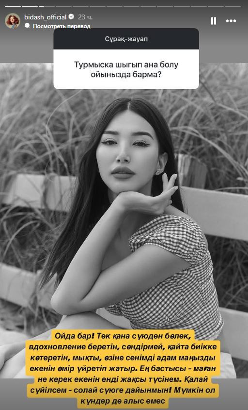 «Ойда бар! Тек қана сүюден бөлек, шабыт беретін, өзіне сенімді адам маңызды екенін өмір үйретіп жатыр. Ең бастысы, маған не керек екенін енді жақсы түсінемін. Қалай сүйілсем, солай сүюге дайынмын. Мүмкін ол күндер де алыс емес», - деп жазды ол.