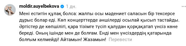 Әнші бұл өз пікірін ашық білдіріп, Threads парақшасында мәлімдеме жасады.
