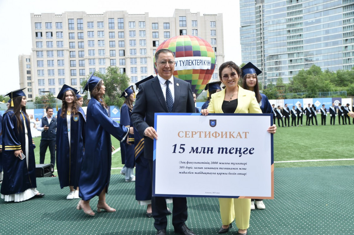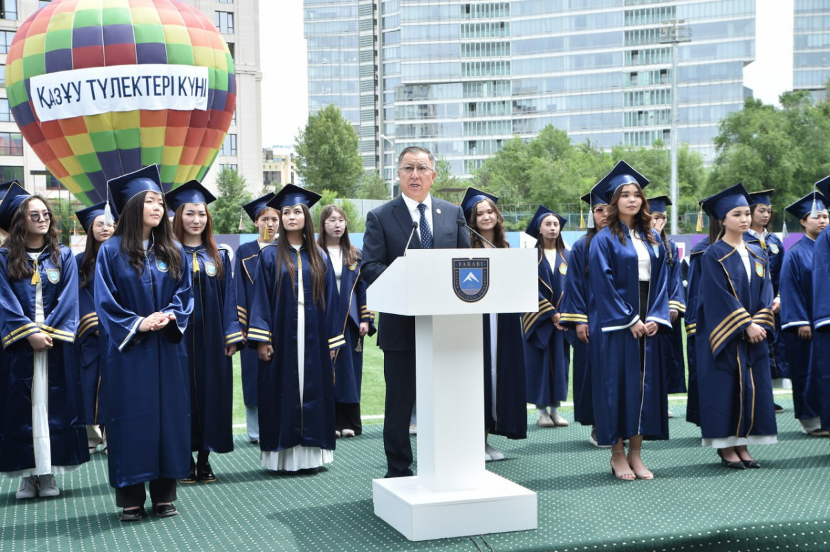 Дәстүрлі Түлектер күнінде оқу орнының басшысы Жансейіт Түймебаев университет дамуына сүбелі үлес қосып, белсенділік танытқан азаматтарға ризашылығын жеткізді.