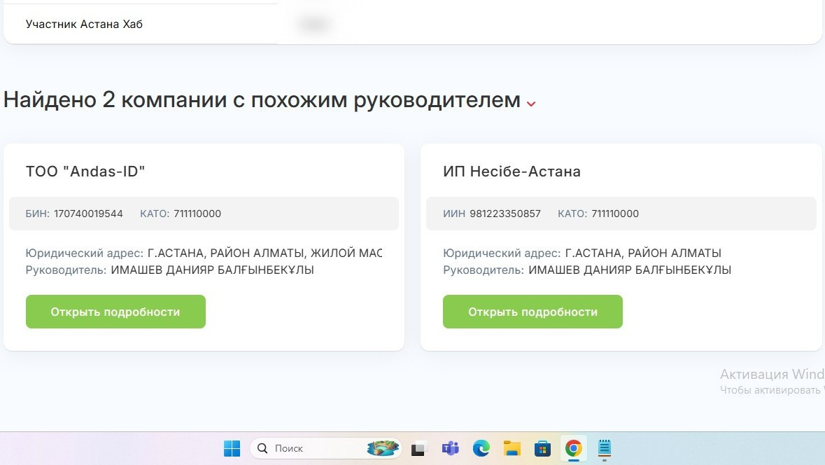 Бірі – Andas-ID ЖШС. Ресми мекенжайы Астана қаласының Алматы ауданына қарасты Оңтүстік-Шығыс тұрғын алабындағы Көкжар тұйық көшесі, 13 үй деп көрсетілген. Екінші кәсібі де Астананың Алматы ауданында орналасқан. "Несібе - Астана" атты жеке кәсіппен айналысады.