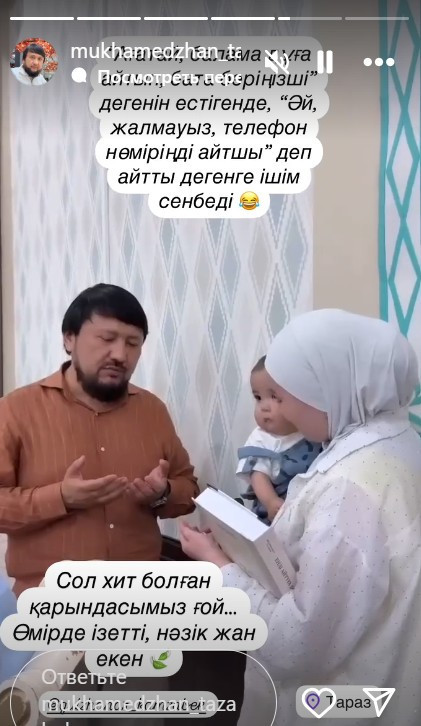 «Ағатай балама дұға айтып, бата беріңізші» дегенін естігенде, «Әй, жалмауыз, телефон нөміріңді айтшы» деп айтты» дегенге ішім сенбеді. Сол хит болған қарындасымыз ғой... Өмірде ізетті, нәзік жан екен», - дейді Мұхамеджан Тазабек.