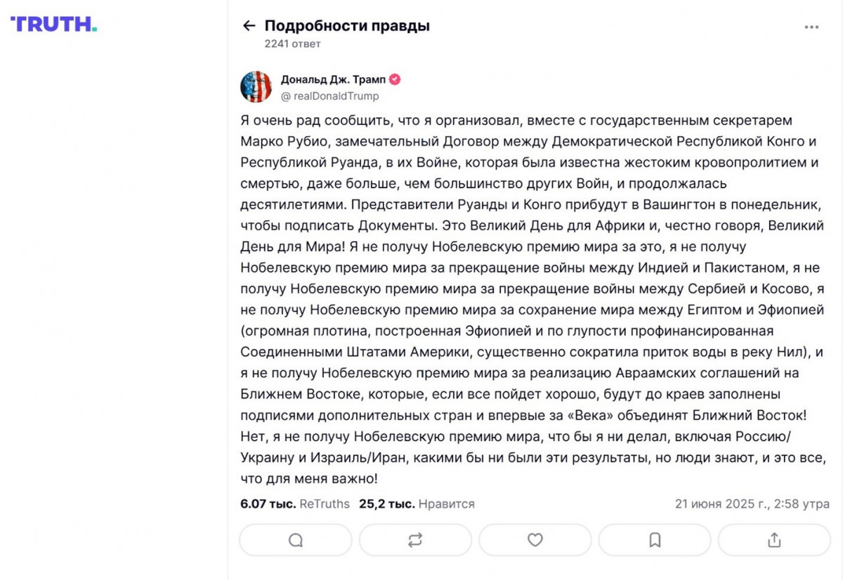 Президент Трамптың жазбасының орысша аудармасы. Скриншот truthsocial.com әлеуметтік желісінен алынды. Авторлығы: @realDonaldTrump
