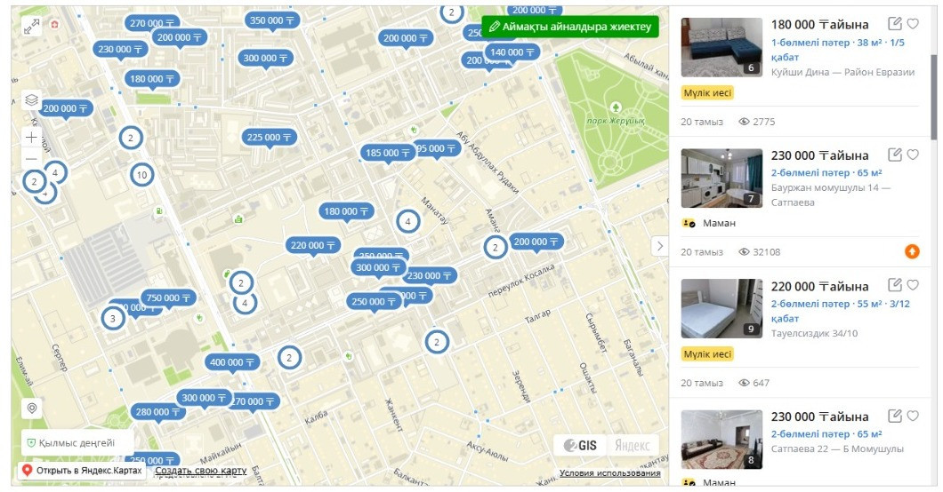 Алматы және Сарыарқа аудандарында пәтер жалдау құны айына шамамен: