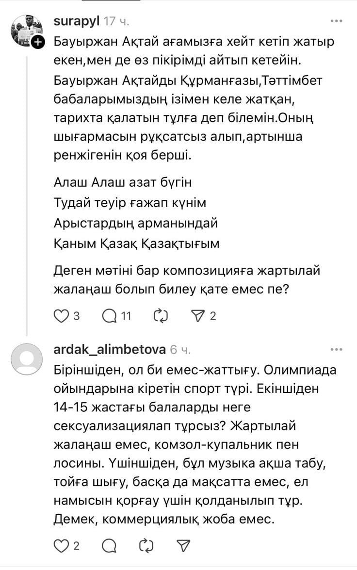 "Біріншіден, ол – би емес, жаттығу. Олимпиада ойындарына кіретін спорт түрі. Екіншіден, 14-15 жастағы балаларды неге сексуализациялап тұрсыз? Жартылай жалаңаш емес, камзол-купальник пен лосины. Үшіншіден, бұл музыка ақша табу, тойға шығу, басқа да мақсатта емес, ел намысын қорғау үшін қолданылып тұр. Демек коммерциялық жоба емес", – деп жауап берді желі қолданушысы.