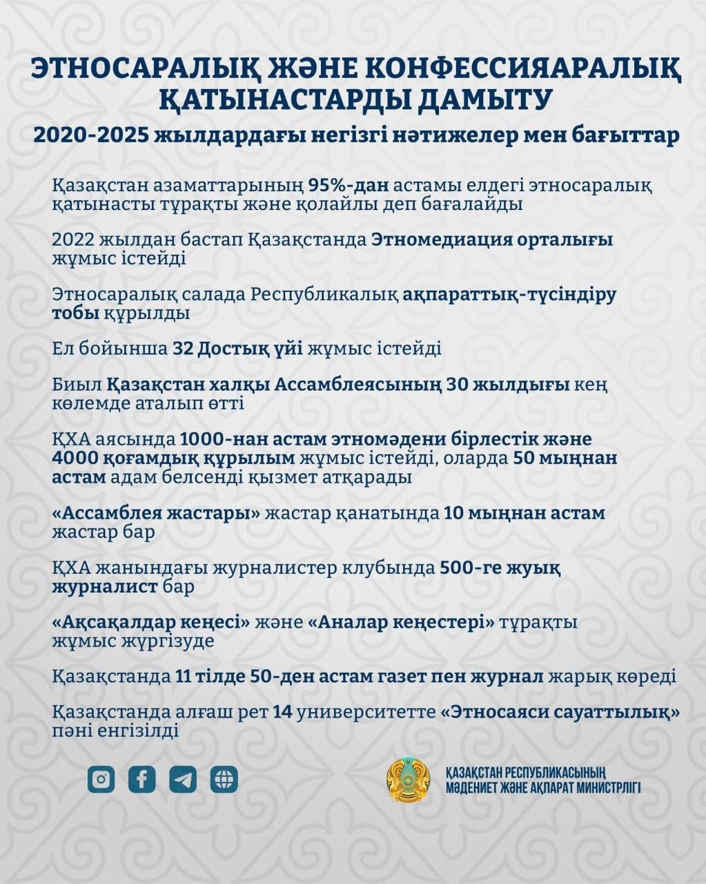 2025 жылы қоғам тарапынан этносаралық саясатқа деген сенім деңгейі жоғары екенін көрсететін дерек тіркелді. Азаматтардың 95 пайыздан астамы елдегі этносаралық ахуалды тұрақты әрі қолайлы деп бағалауда.