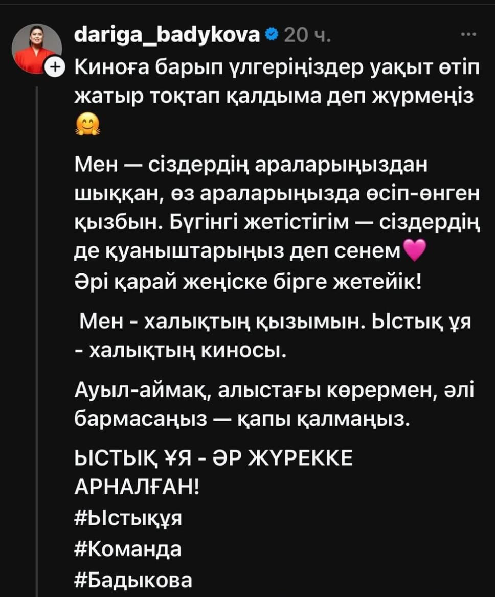 Айта кеткен жөн, бұған дейін Дариға Бадықова өзінің "Ыстық ұя" фильмі жайлы қуанышты хабарын бөліскенін жазып едік.