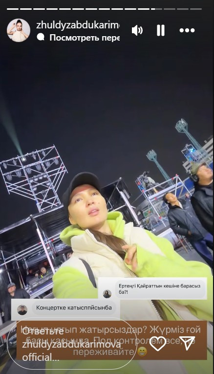 «Жүрміз ғой басы-қасында. Бәрі бақылауда, уайымдамаңыздар. Концертке дайындық қызу жүріп жатыр. Сахна сыртында жүрген адам көп. Мына масштаб бұрынғыдан өзгеше болайын деп тұр. Сахнада сіздер біле бермейтін талай сәттер болады. Ертең келіп, көзбен көріңіздер», – деді актриса.