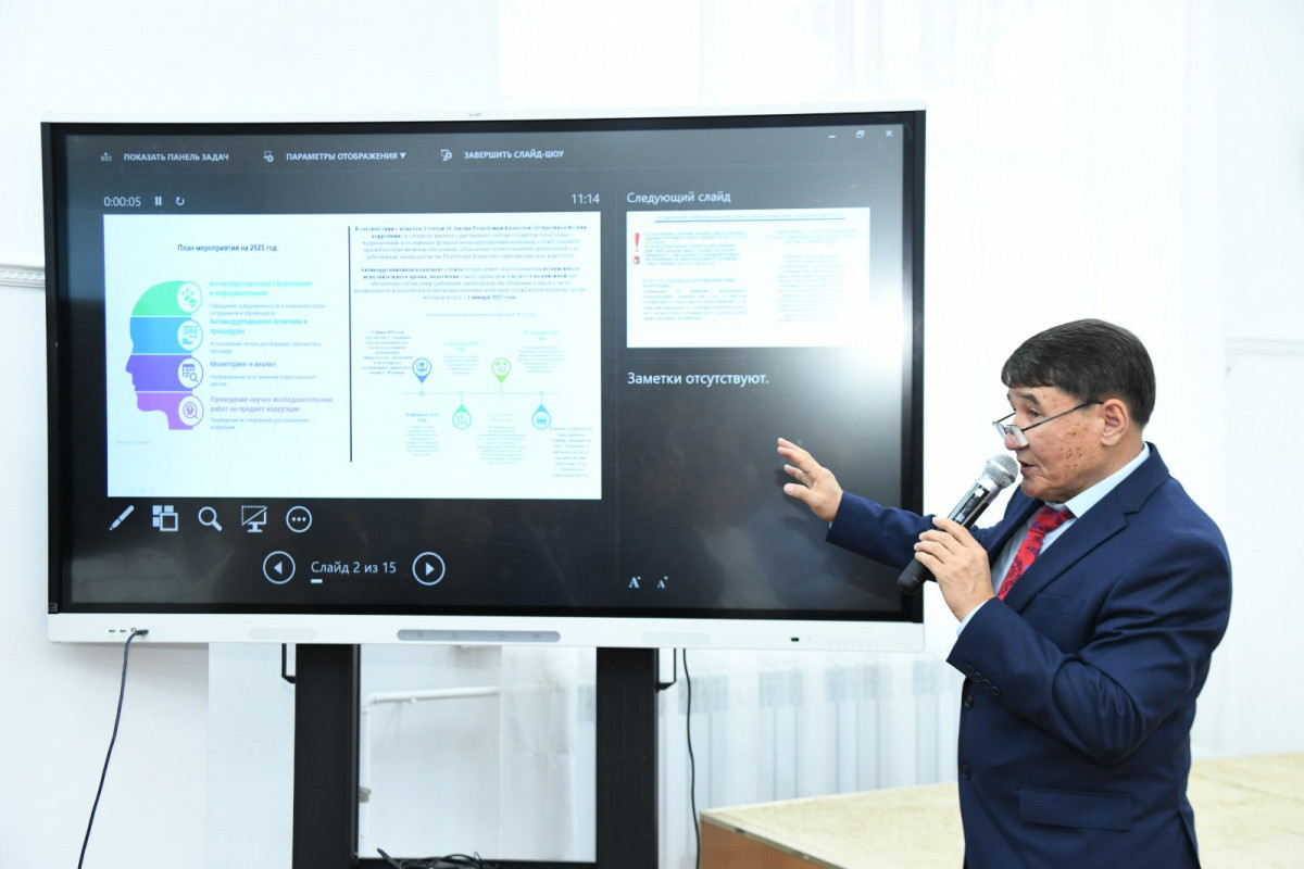 Кездесу барысында университеттің сыбайлас жемқорлыққа қарсы комплаенс-қызметінің басшысы Құрманғазы Мәдиев қоғамдағы жемқорлық тәуекелдеріне тоқталып, оған қарсы күресте мониторинг жүргізу, тәуекелдерді талдау, сыбайлас жемқорлыққа қарсы мәдениетті қалыптастыру және мүдделер қақтығысын реттеу сияқты кешенді шаралардың маңыздылығын атап өтті. Сонымен қатар семинарға қатысушыларға университетте осы бағытта атқарылып жатқан жұмыстар мен нақты нәтижелері таныстырылды.