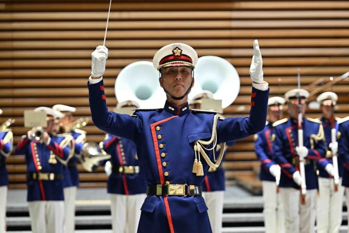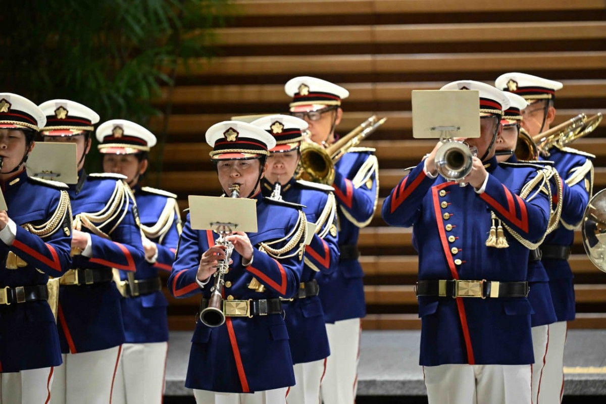 Құрмет қарауылы сап түзеп, қос елдің мемлекеттік әнұрандары шырқалды. Құрмет қарауылының бастығы рапорт бергеннен кейін Қасым-Жомарт Тоқаев пен Санаэ Такаичи бір-біріне ресми делегация мүшелерін таныстырды.