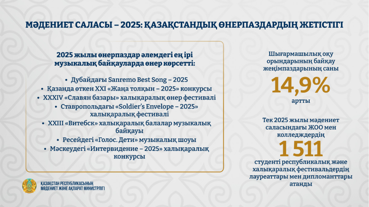 Сонымен қатар биыл шығармашылық оқу орындарының студенттері арасынан байқау жеңімпаздарының саны 14,9% артты. Тек 2025 жылдың өзінде мәдениет саласындағы жоғары оқу орындары мен колледждердің 1 511 студенті республикалық және халықаралық фестивальдің лауреаттары мен дипломанттары атанды.