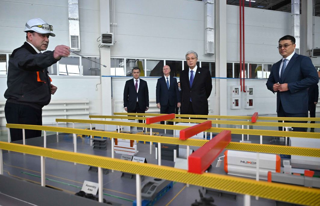 Қасым-Жомарт Тоқаев цехтардағы құрастыру жұмыстарын аралап көріп, қорғаныс өнеркәсібі кешеніне қарасты кәсіпорынның технологиялық процестерімен және өндірістік мүмкіндіктерімен танысты.