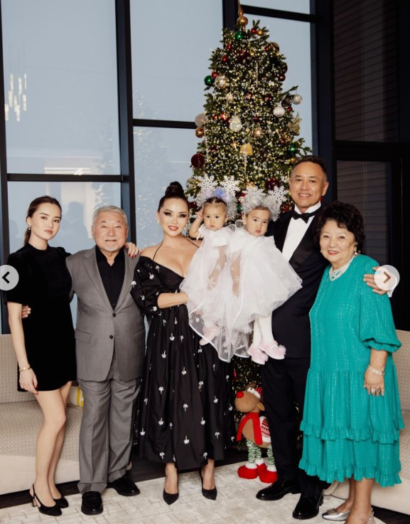 Суретте жолдасы екеуі қыздарымен және ата-анасымен мерекелік шыршаның жанында тұрғанын көруге болады.
