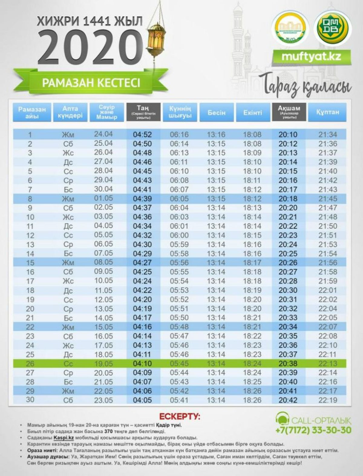 Рамазан айы басталды. Ораза айындағы сәресін ішу және ауызашар уақыттарының өңірлер бойынша кестесін ұсынып отырмыз. Қазақстан мұсылмандары діни басқармасының мәліметіне сүйенсек, мамыр айының 19-ынан 20-сына қараған түні – қасиетті Қадір түні. Биыл пітір садақа жан басына 370 теңгеден белгіленді. Төтенше жағдайға байланысты мобильдік қосымша арқылы онлайн төлеуге болады. Карантинге байланысты тарауих намазы мешіттерде оқылмайды. Әр адам өз үйінде оқиды.