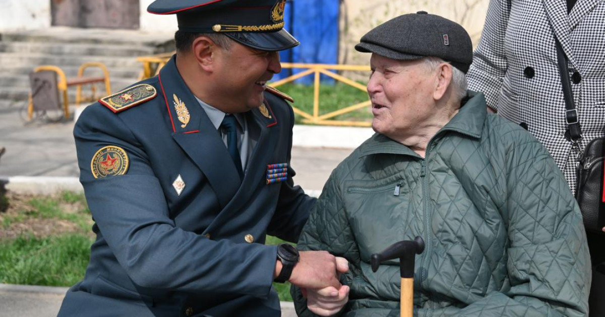 Әскери оркестр ардагердің сүйікті әуендерін орындап, нағыз мерекелік көңіл күй сыйлады.