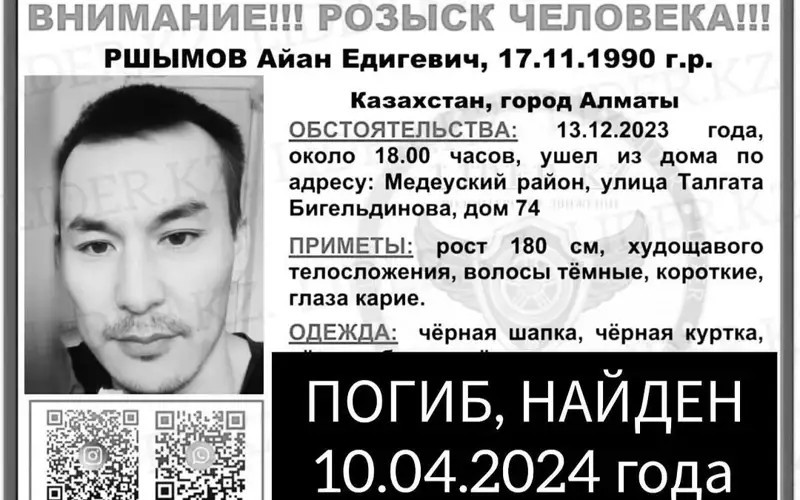 Еріктілер ұйымының мәліметінше, 1990 жылы туған Ршимов Айян Едігеұлы 2023 жылғы 13 желтоқсан күні жоғалып кеткен. Ол кешке қарай үйінен шығып, сол күйі қайтып оралмаған.