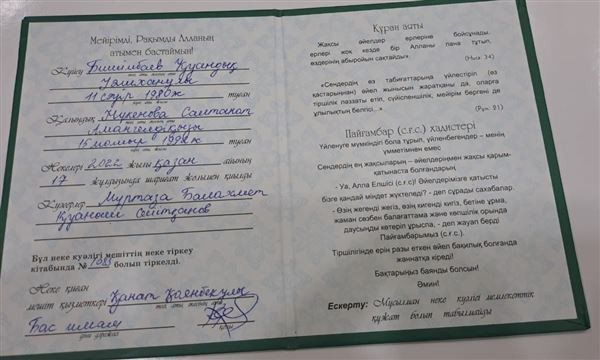 Осыған орай ҚМДБ-ның ішкі жұмыс тәртібінің тиісті талабына сәйкес мешіт қызметкерлері неке қию рәсімі алдында болашақ ерлі-зайыптылардан Азаматтық хал актілерін тіркеу (АХАТ) бөліміне тіркелгенін растайтын куәлікті талап етеді.