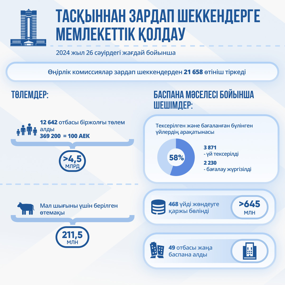 Биылғы 26 сәуірдегі жағдай бойынша 12 642 отбасы 100 АЕК мөлшерінде 4,5 млрд-тан астам теңге көлемінде біржолғы төлем алды. Шығын болған мал басы үшін берілетін төлем көлемі 211,5 млн теңгеге жетті.