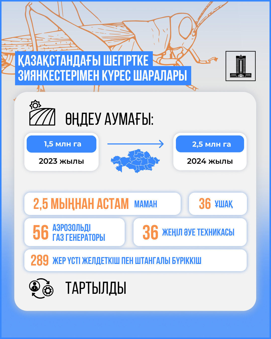 Үкіметтің мәліметінше, 2024 жылы зиянкес жәндіктердің таралуының табиғи өсімі байқалады. Олардың таралу аумағының артуы 2023 жылы да анықталған болатын. Сол кезде 1,5 млн га аумақ өңделді. Ал биыл шегіртке зиянкестеріне қарсы өңдеу жоспарланған аумақ – 2,5 млн га, оның ішінде Түркістан облысы бойынша – 271 мың га.
