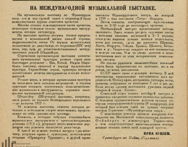 Осы сапар жайлы тағы бір мақаланы таптық. Мәскеуде шығатын «Рабис» деп аталатын журналдың қыркүйек айындағы 34 нөмірі. Ол жерде белорус әншісі Ирма Яунзем Франкфурт сапары жайлы азды-көпті тоқталған екен. Шынын айту керек, дәл біз үшін аса қызықты ештеңе таппадық. Мақала авторы фестивальға түрлі ұлт өкілдері қатысқанын, кімнің не көрсеткенін, тіпті Моцарт пен Бетховеннің өз қолымен жазған нота қолжазбалары жайлы тоқталған екен. Бір іліп алатыны, осы мақаладан біз Әміре бастаған топтың 9 концерт бергенін және сол концерттер «Франкфурт опера» (Frankfurt opera) залында өткенін білдік.