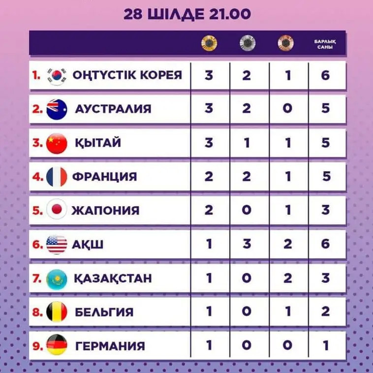 Франция астанасы Парижде өтіп жатқан Олимпиада ойындарында Қазақстан құрамасы жалпы медальдар кестесінде 7-орында тұр, – деп хабарлайды Aikyn.kz.