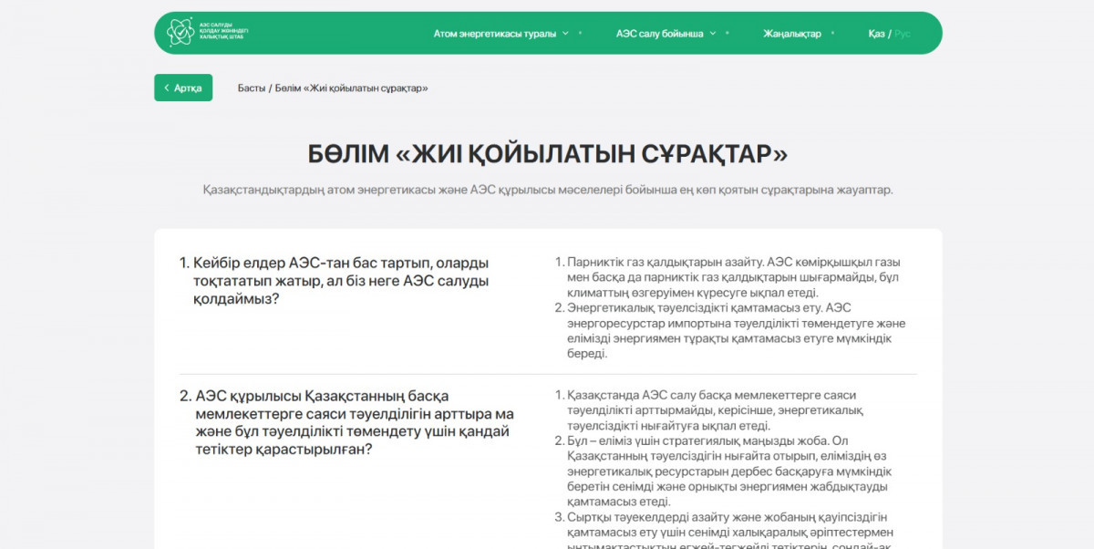 Әрине, сайттағы ең танымал бөлімдердің бірі «Жиі қойылатын сұрақтар» болмақ, мұнда АЭС құрылысы, дауыс беру процесі, оның артықшылықтары мен ықтимал қауіптері туралы барлық сұрақтарға қарапайым тілмен жауаптар берілген. Ең жиі қойылатын алты сұрақтың жауабы ұсынылған, олар экологиялық қауіпсіздіктен бастап саяси тәуекелдерге дейінгі мәселелерді қамтиды.