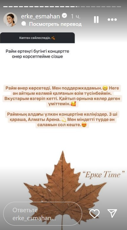 «Райм өнер көрсетеді. Мен қолдаймын. Неге ән айтқым келмей қалғанын түсінбеймін. Талғамым өзгеріп кетті. Қайтып орнына келер деген үміттемін. Раймның алдағы үлкен концертіне келіңіздер. 3 қараша, Алматы Арена. Мен міндетті түрде ән саламын сол кеште», - дейді әнші.