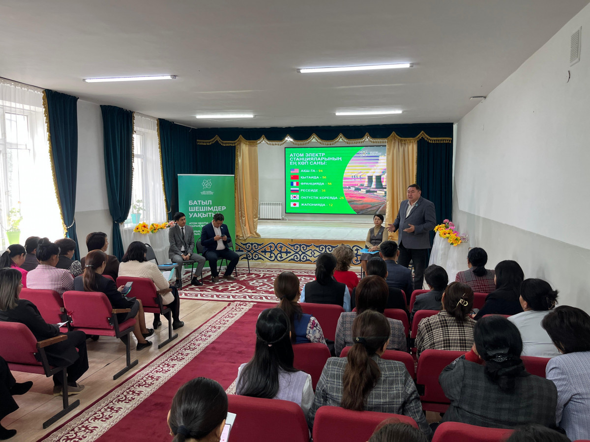 АЭС салуды қолдау жөніндегі Республикалық Халықтық штаб мүшелері Болат Керімбек, Руслан Қожасбаев және өңірлік Халықтық штаб мүшелері Гүлнар Тойлыбаева, Арыстанғали Арын Алакөл ауданына сапары барысында Үшарал қаласындағы Абай атындағы орта мектептің ұжымымен кездесті.