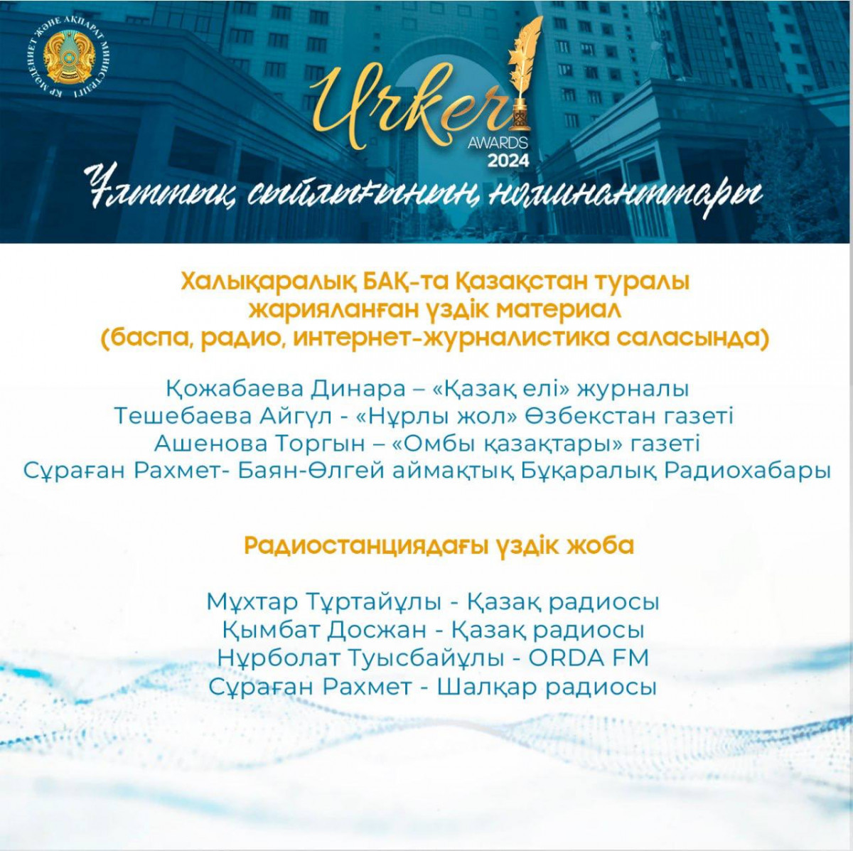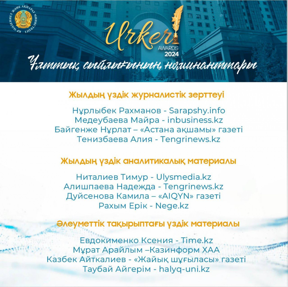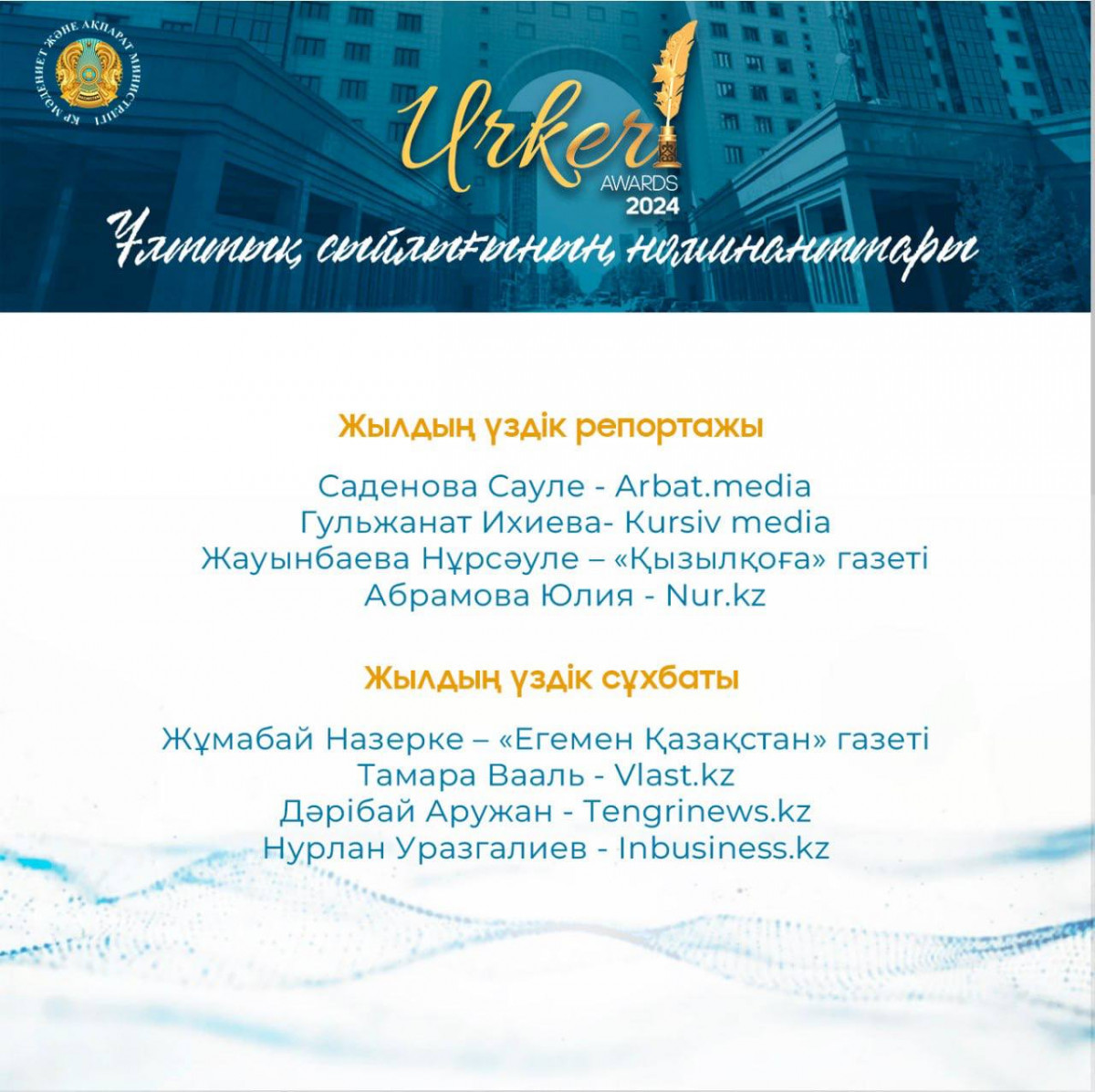 «ҮРКЕР – 2024» Ұлттық бәйгесінің жеңімпаздары 27 қыркүйек күні белгілі болады. Лауреаттарды марапаттау рәсімі Астана қаласы «Қазмедиа» орталығында өтеді. Жеңімпаздарға «ҮРКЕР» естелік мүсіншесі және бір миллион теңге мөлшеріндегі ақшалай сыйлық табысталады.