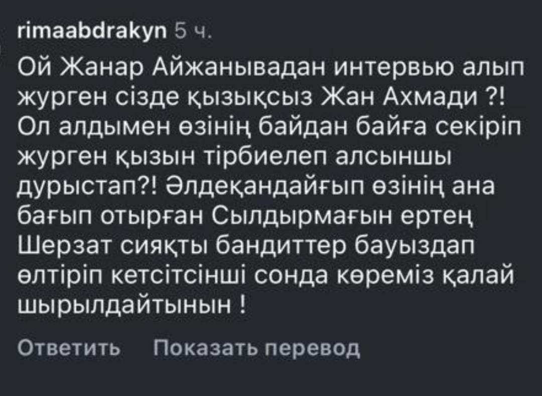 "Құрметті ағайындар! Ауыз менікі деп оттай бермеңіздер! Маған бір қатын жазыпты: үйіңдегі әлдеқандай қылып өсіріп отырған сылдырмағыңды, жиеніңді өскен кезде бандиттер келіп бауыздап өлтірсін. Мен соны тілеймін депті. Сонда ол қандай ана?! Сендер қандай анасыңдар? Аузыңа келгенді оттап жатырсыңдар. Қызымды жерден алып, жерге салып жатыр. Мен ешкімге ештеңе деген жоқпын ғой. Мен мұндай нәрсені жақсы түсінемін. Менің де 12 жыл бұрын інімді өлтіріп кеткен. Кәдімгі атақты бір адамдар екен. Істемегендері жоқ. Мен ешкімді шулатқан жоқпын ғой. Өзім шештім. Оны өтіп кеткенбіз. Мені де қорқытқан сол кезде тұқымыңмен құртамын деп. Сонда қандай анасыңдар сендер? Біреудің баласына өлім тілеп отырған. Сендер артықсыңдар ма сонда? Неше түрлі қатындар, 12-де бір гүлі ашылмаған, 16, 17-дегі қыздар жазып жатыр. Сендерге не жоқ? Мен шынымен ешкімнің отбасына араласпаймын, айтқаным айтқан. Ешкімге араласпаймын", – деді ол. (Жанар Айжанованың пікірі қаз-қалпында жарияланды - ред.)