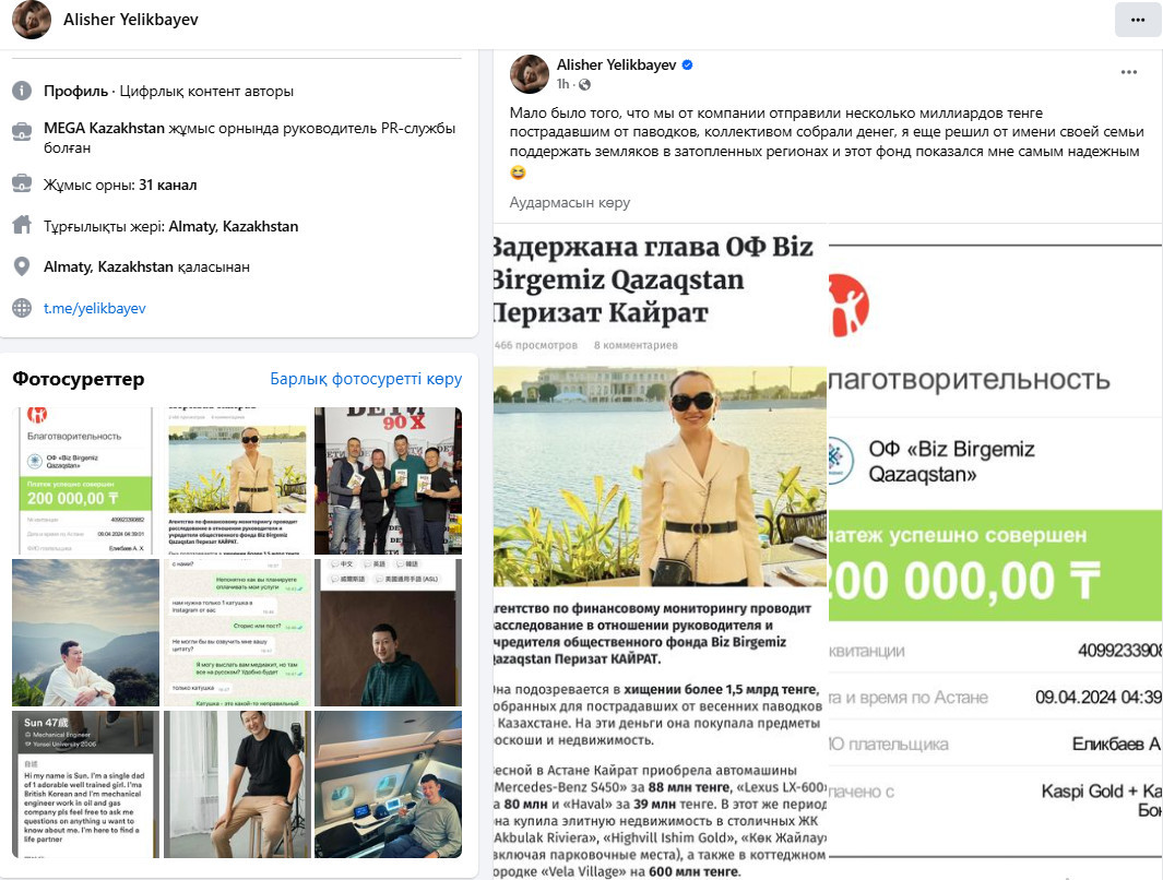 Блогер Әлішер Елікбаев су тасқынынан зардап шеккендерге қаржы жинаған Biz Birgemiz Qazaqstan қорына ақша аударғанын айтып Facebook-тағы парақшасында жазба жариялады.