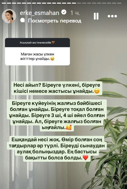 Желідегі оқырман өзінен жасы үлкен жігіттер ұнайтынын айтқан. Әнші Ерке Есмахан өмірде ешкімді сынауға болмайтынын, адамның бақыты басты орында екенін жеткізді.