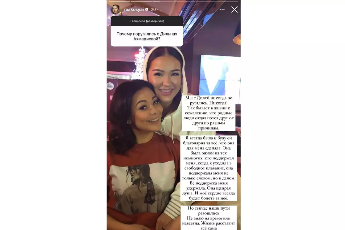 Мақпал Исабекова Instagram-дағы парақшасында оқырмандарын қызықтырған сұрақтарға жауап берді. Соның ішінде Дильназ Ахмадиевамен неге араласпай кеткенін айтты.