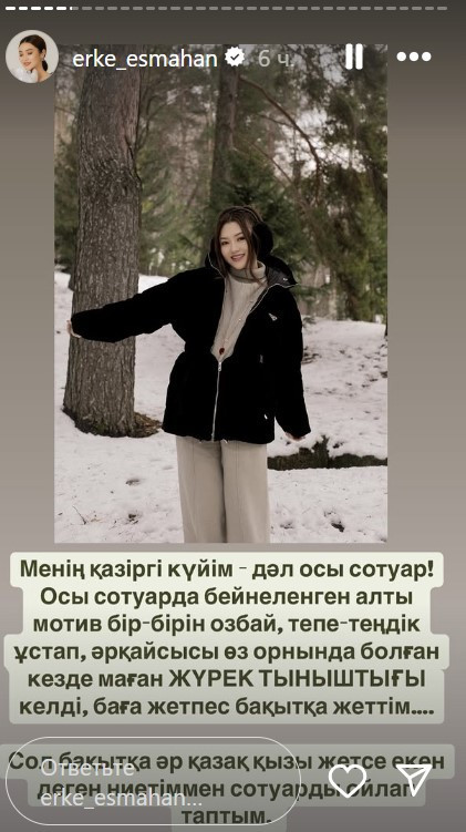 «Бүгін көптен бері айтып жүрген туындымды сіздерге таныстырамын. Ол – осы суретте көзге оттай басылып тұрған әшекей. Әдемілігімен көздің жауын алып тұр. Сұлулығымен қоса терең мазмұнды. Әр әйелдің бақытын құрайтын денсаулық, отбасы, сәби сүю, карьера, сұлулық және байлық – бәрі бірікті. Әдемі туынды дүниеге келді. Еркенің бренді сіздерге сәттілік алып келсін, бағы жұғысты болсын. Шын жүректен тіледім», – деді Ерке Есмахан.