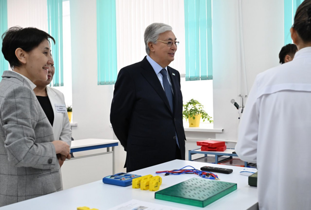 Қасым-Жомарт Тоқаев мектептің білім беру ісіндегі ерекшеліктерімен және оқушылардың зертханалық жұмыстарымен танысты.