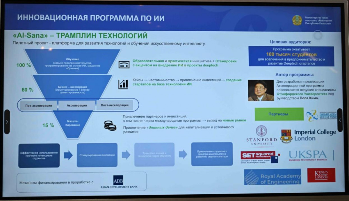 AI-Sana – бұл студенттер арасында жасанды интеллект дағдыларын жан-жақты дамытуға бағытталған бірегей бағдарлама. Ол 100 мың қатысушыны қамти отырып, ұлттық экономиканың әлеуетін ашуға және технологиялық кәсіпкерлікті қолдауға бағытталған. Сондай-ақ Қазақстанның технологиялық және экономикалық өсуінің драйвері бола алатын DeepTech-стартаптарды құруға ерекше назар аударылды.