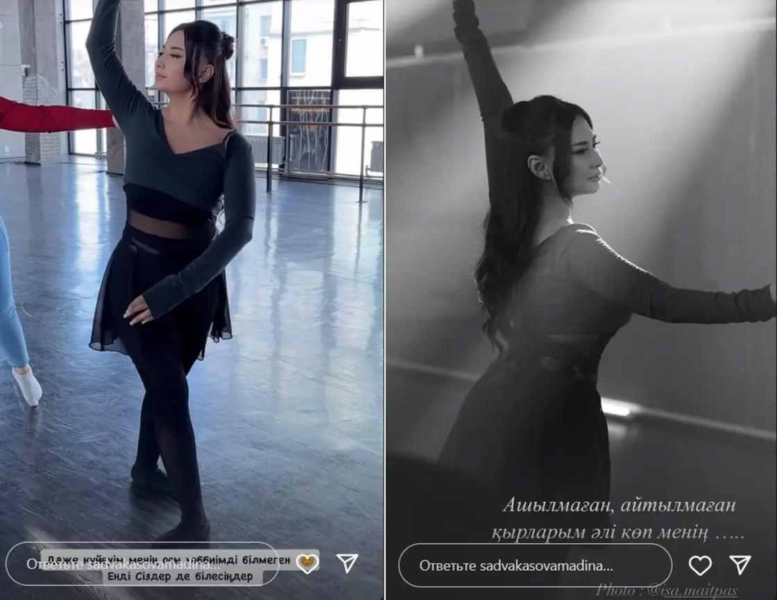 Өнер иесі Instagram-дағы stories бөлімінде хореография залында би қимылын үйреніп жүргенін көрсетті.