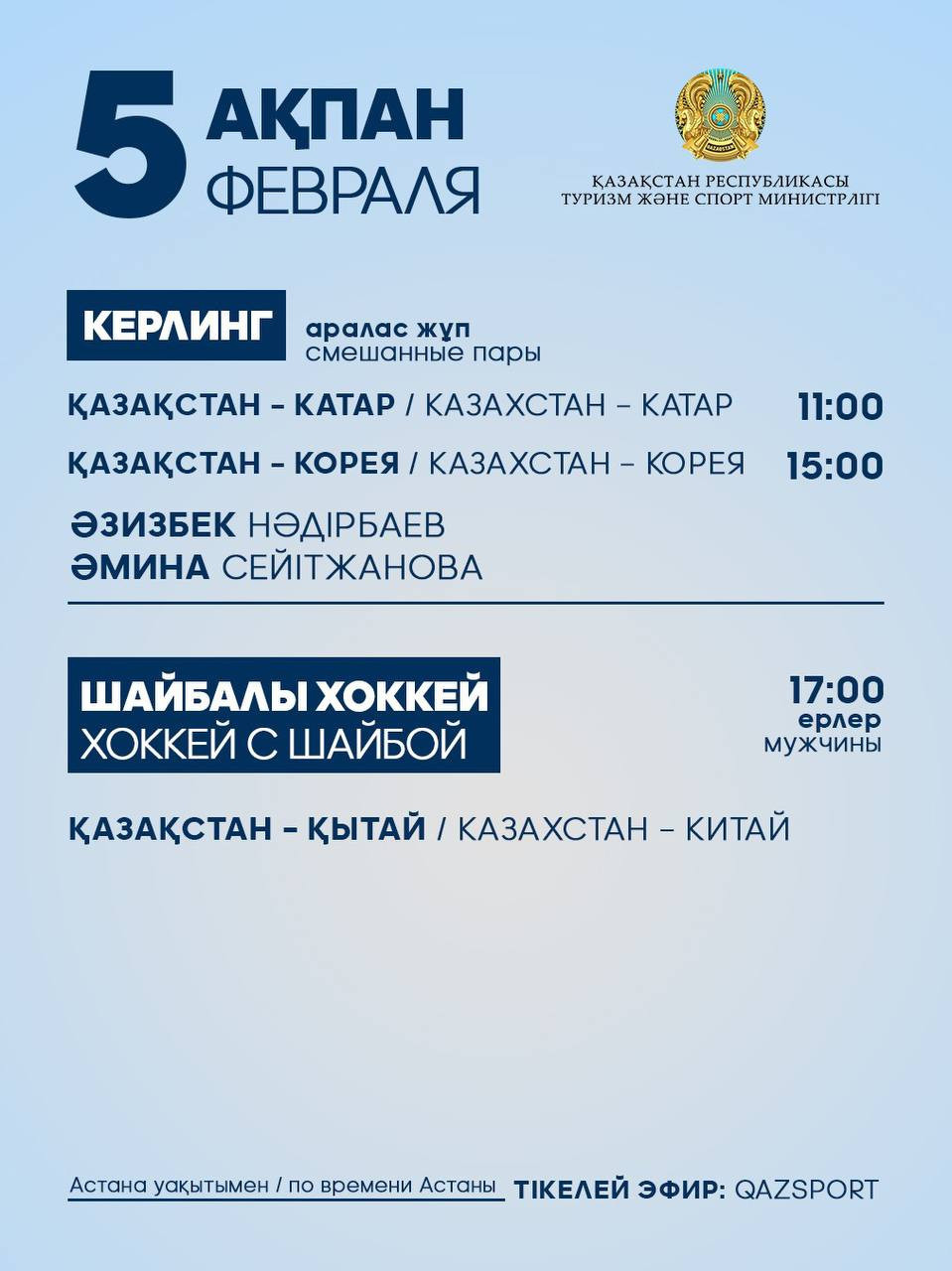 Белгілі болғандай ертең, 5 ақпанда екі спорт түрінен: керлинг пен шайбалы хоккейден жарыс өтеді.