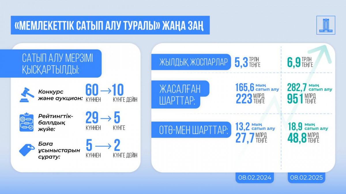 Қазақстанда 2025 жылғы 1 қаңтардан бастап күшіне енген жаңа жеңілдетілген ережелер бойынша мемлекеттік сатып алу туралы алғашқы шарттар жасалды. Оларды қабылдау жобаларды, соның ішінде әлеуметтік маңызы бар жобаларды жедел іске қосуға және олардың қымбаттауындағы тәуекелдерді азайтуға мүмкіндік береді. Жеңімпаздар негізінен жергілікті компаниялар болады, бұл аймақтардың бизнесі мен экономикасына қолдау көрсету болып саналады, – деп хабарлайды Aikyn.kz.