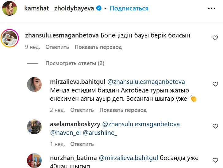 «Мен де естідім, біздің Ақтөбеде енесімен тұрып жатыр, аяғы ауыр деп. Босанған шығар», «Босанды, қазір қырқынан шықты», «Бөпеңіздің бауы берік болсын!», – деп жазды желі қолданушылары.