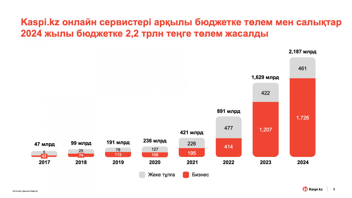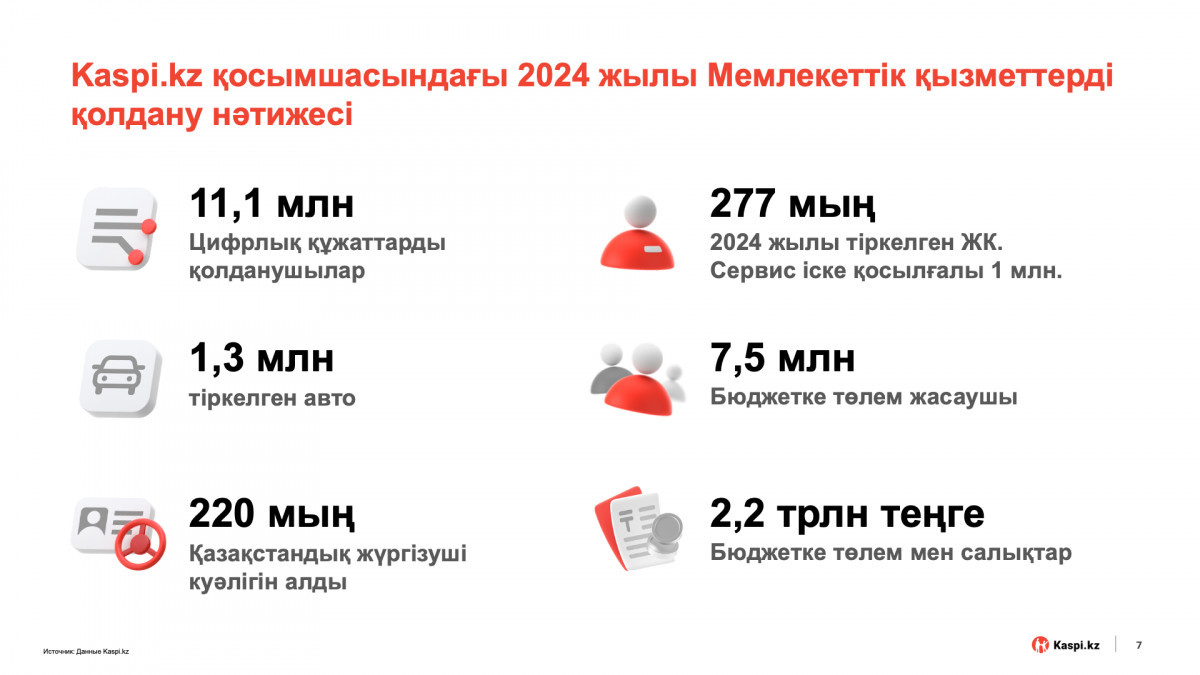 2024 жылы 7,5 миллион адам Kaspi.kz арқылы салық төледі. Сервис арқылы жеке тұлғалар мен жеке кәсіпкерлер төлеген салық көлемі жыл ішінде шамамен 2,2 трлн теңгені құрады. Бұл 2023 жылмен салыстырғанда 34%-ға көп.