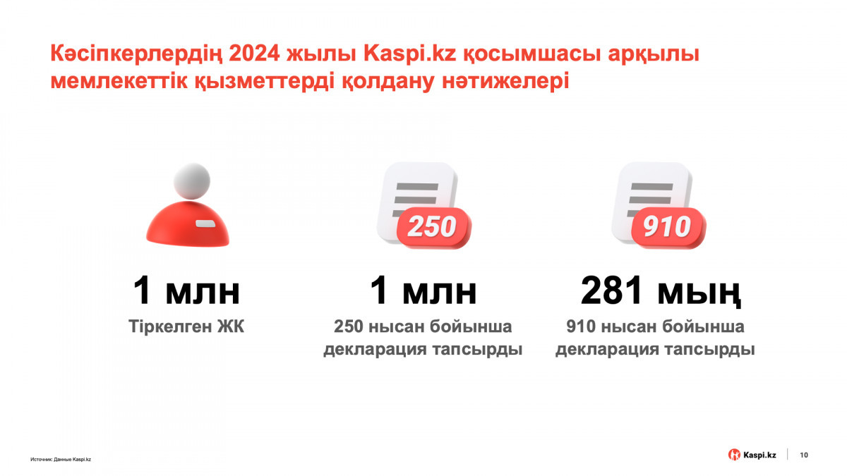 Жаңа сервистерге ең қатты қуанатындар – кәсіпкерлер. Kaspi.kz арқылы сервис іске қосылған уақыттан бері 1 миллионнан астам ЖК тіркелді. 1 миллион адам 250-нысан бойынша, тағы 281 мың адам 910-нысан бойынша декларация тапсырды. Тек 2024 жылы ғана бизнес бюджетке 1,7 трлн теңгеден астам салық төледі.