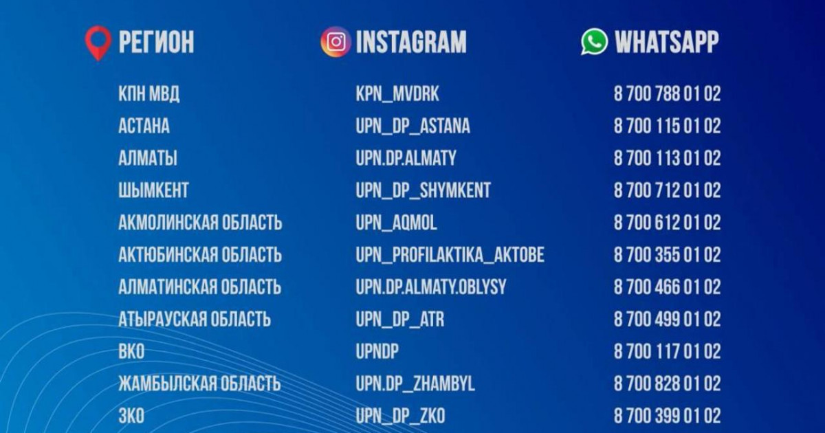 Біз әр өңір бойынша кері байланыс үшін телефон нөмірлерін қалдырамыз. Сіз маңызды ақпаратты анонимді және қауіпсіз түрде хабарлай аласыз. Бұл қылмыстың алдын алып, біреудің өмірін құтқаруға көмектесуі мүмкін.