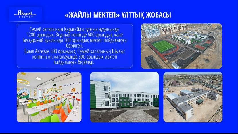 Мемлекет басшысының бастамасымен іске асырылып жатқан «Жайлы мектеп» ұлттық жобасы аясында Семей қаласының Қарағайлы тұрғын ауданында 1 200 орындық, Бесқарағай ауылында 300 орындық мектеп ашылды. Биыл Аягөзде 600 орындық, Семей қаласының Шығыс кентінің оң жағалауында 300 орындық мектеп пайдалануға беріледі.
