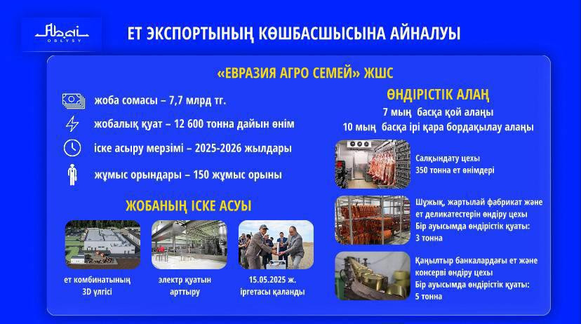 Ет кластерін дамыту аясында Жаңасемей ауданы Шақаман ауылында «ЕвразияАгроСемей» ЖШС тәулігіне 35 тонна ет өңдейтін кешеннің құрылысы басталды. Мұнда жылына 12,6 мың тонна ет өнімдері шығарылып, 7 мың бас қойға арналған бордақылау алаңы дайындалған.