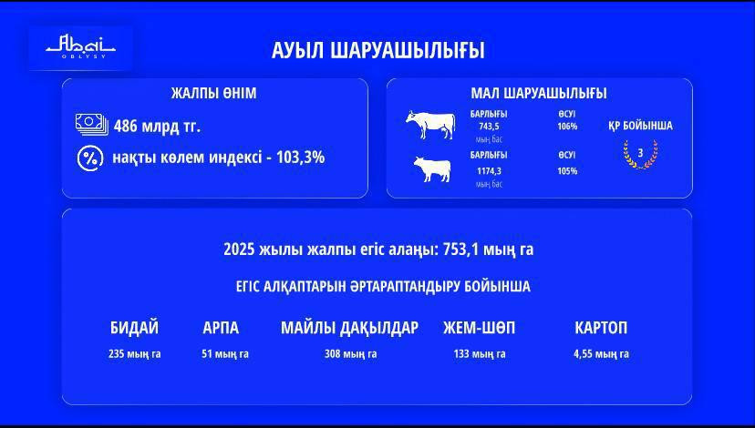 Облыс әкімі Берік Уәли өңірдің алдағы жылдардағы даму жоспары туралы баяндамасында ауылшаруашылық саласындағы жобаларға тоқталды. Биыл облыста ауыл шаруашылығы өнімінің жалпы көлемі 486 миллиард теңгеге жетіп, өсім 103 пайызды құрады. Ірі қара мал саны 743 мың басқа жетіп, республика бойынша 3-орында тұр.