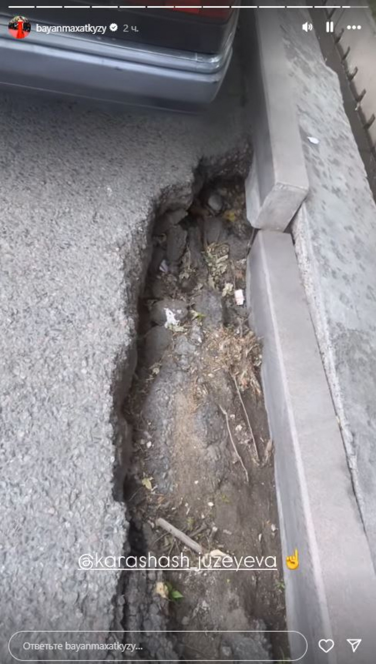 Кадрда жолдың ортасы опырылып, тіпті бордюр бөлігінің де ойыққа түсіп кеткені көрінеді. Б. Алагөзова бұл жағдайдың қаншалықты қауіпті екенін атап өтіп, мұндай шұңқырлар көлік жүргізушілері үшін үлкен қауіп төндіретінін ескертеді.