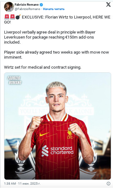 Англияның "Ливерпуль" клубы Германия құрамасы мен "Байер" командасының жартылай қорғаушысы Флориан Вирцті ресми түрде қатарға қосты.