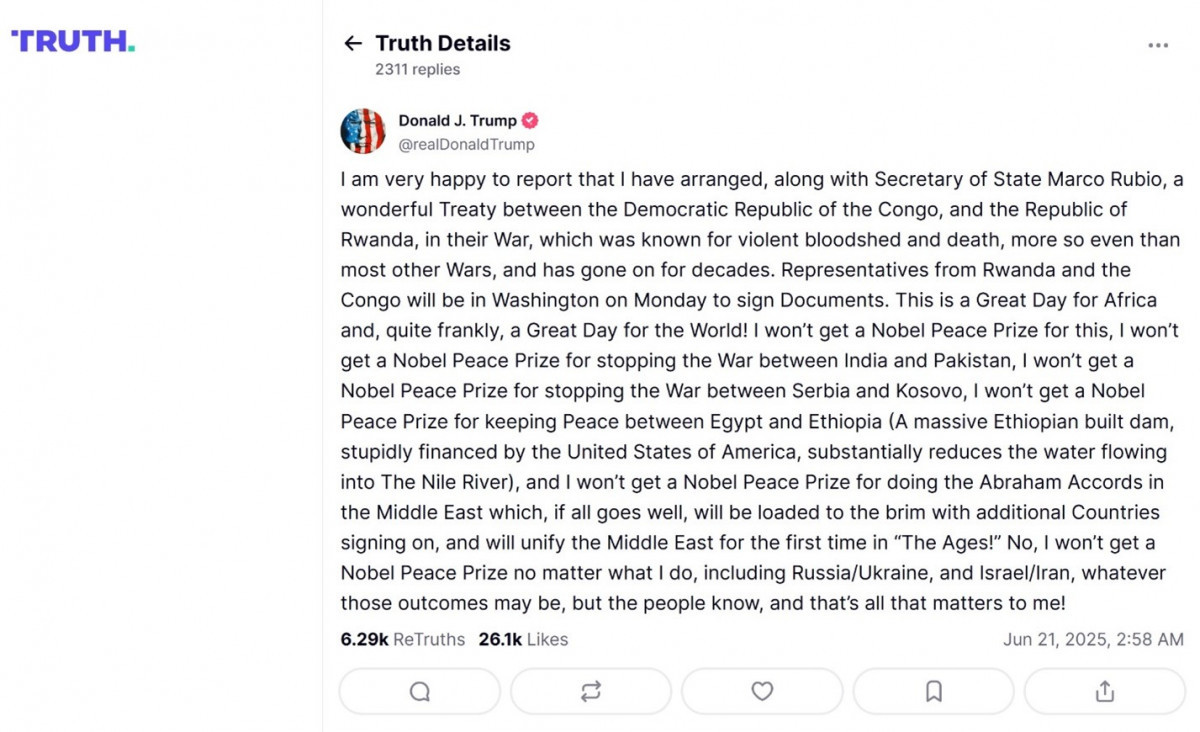 Жұма күні әлеуметтік желідегі жазбасында Трамп «өзім шештім деген қақтығыстар тізімін жариялады. Олардың қатарында Үндістан мен Пәкістан, сондай-ақ Трамптың алғашқы президенттік мерзімі кезінде жасалған Израиль мен мұсылман елдері арасындағы Авраам келісімдері де бар. Ол: «Не істесем де, мен Нобель бейбітшілік сыйлығын ала алмаймын», – деп жазбасын түйіндеген.
